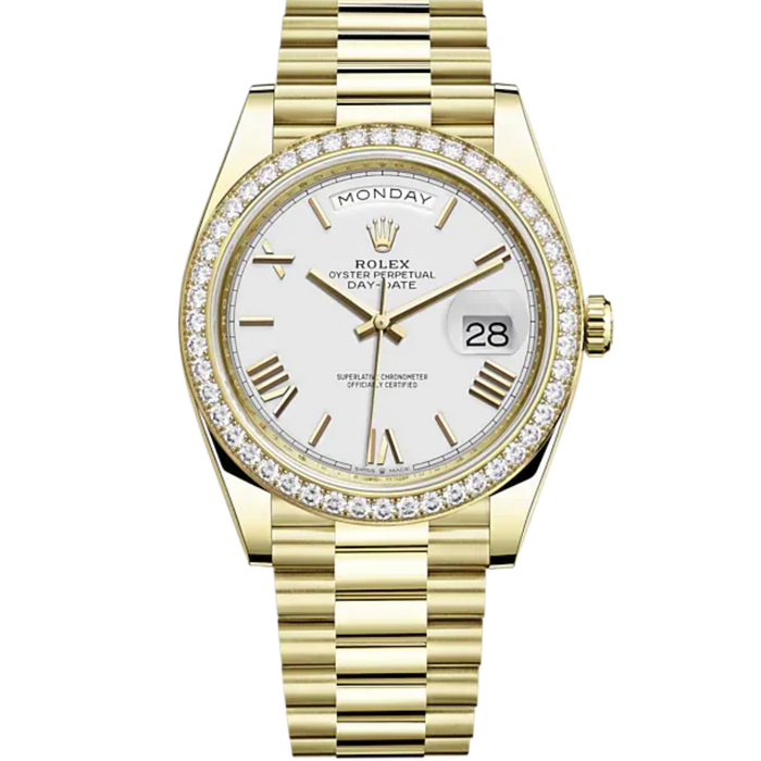 Rolex Day Date Ref. 228348RBR Yellow Gold White Roman Dial Diamond Bezel