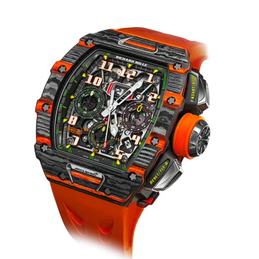 RM 11-03 McLaren: Created in collaboration with McLaren Automotive, this watch features an automatic winding flyback chronograph movement and a design inspired by the McLaren 720S supercar.