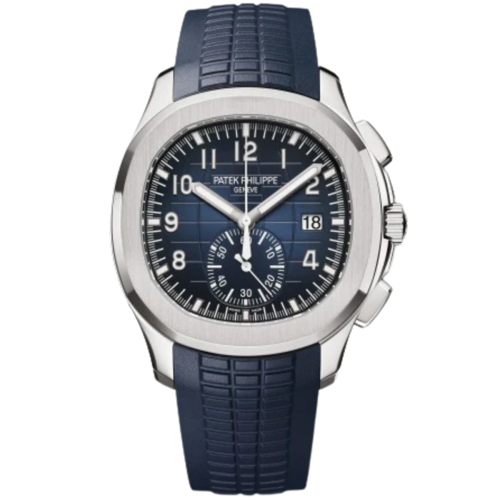 Patek Philippe is introducing a new version of their Aquanaut flyback chronograph model, which features a white gold case and a midnight blue dial and composite strap. The dial has a black-gradient rim and the case is water-resistant up to 120 meters. The case also has a combination of polished and satin finishes. Additionally, the 60-minute counter at 6 o'clock mirrors the shape of the bezel. The fold-over clasp has four independent catches for added security. The overall style of the watch is described as "contemporary casual chic."