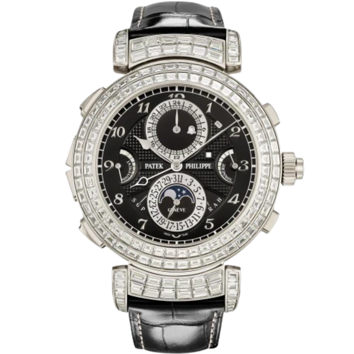 6300/400G Grand Complications 49.4mm Shiny Black Alligator Leather Strap Ebony Black Opaline Dial White Gold Baguette Diamond-set Bezel