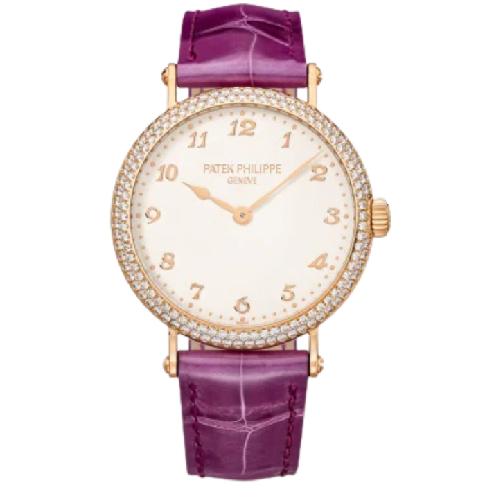 7200/200R Calatrava 34.6mm Shiny Royal Purple Alligator Strap Silvery-Grained Dial Diamond Case-set Rose Gold Bezel
