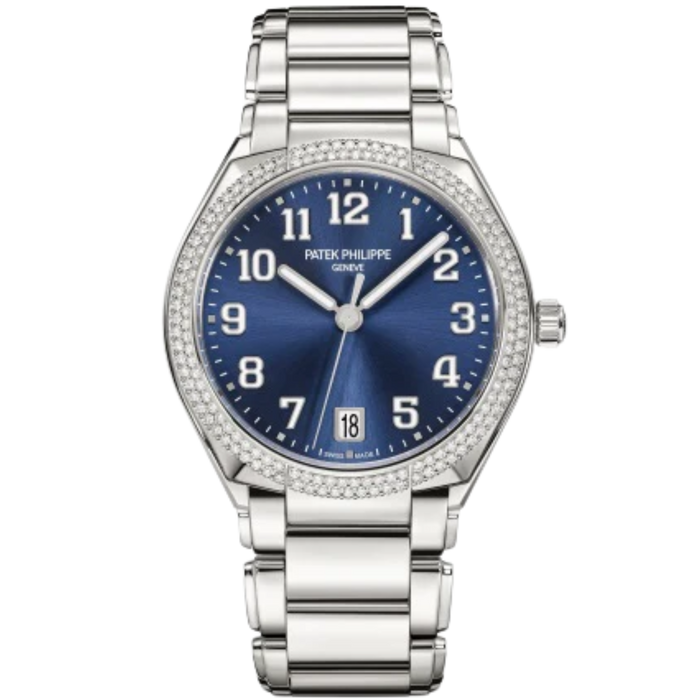 Patek Philippe has debuted their latest self-winding mechanical ladies' watch - the Twenty~4 Automatic. Its round steel case is adorned with a diamond-set bezel and available with either blue or gray sunburst dials, both subtly fading to black on the periphery. Inside beats a caliber 324 S C self-winding movement, which can be viewed from the sapphire crystal case back. This timepiece keeps track of hours, minutes and seconds, along with a date feature in a small aperture at 6 o'clock - perfect for modern women's active lifestyles.
