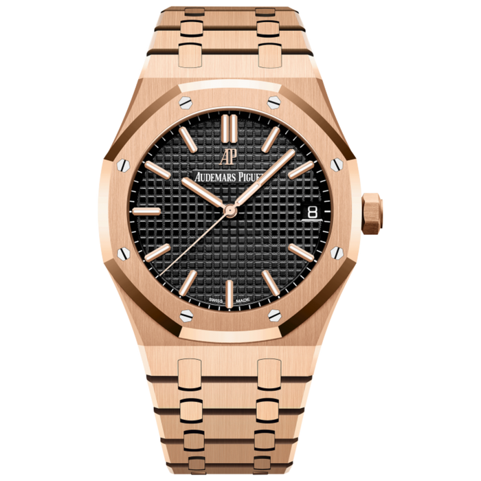 The Selfwinding Royal Oak in pink gold boasts bold new features, such as wider indexes and a minute train on the outside rim. Moreover, the date window has been relocated further from the center.