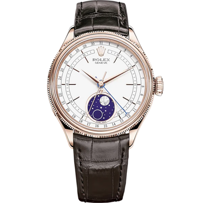The Cellini Moonphase features a white lacquer dial with a blue enamelled disc at 6 o’clock, representing the Full and New Moon. The former is highlighted by a meteorite applique and the latter by a silver ring. Furthermore, the moon phase can be determined through its indicator set at 12 o’clock on the subdial as it follows the cycle of the Full and New Moon. It also has a centre hand with a crescent moon tip that displays the date along its circumference.