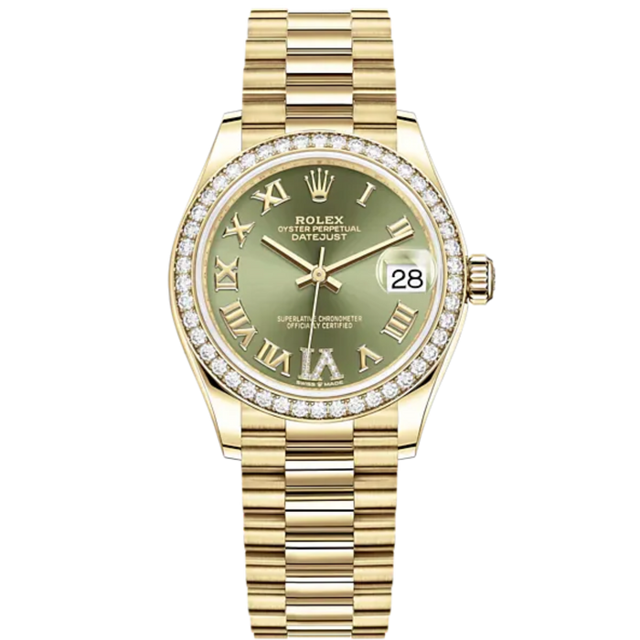 Datejust 31 31mm President Bracelet and 18 CT Yellow Gold with Olive-Green Diamond Dial Diamond-Set Bezel
