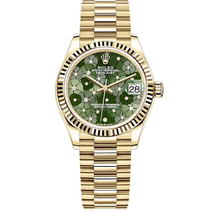 Datejust 31 31mm President Bracelet and Yellow Gold with Olive-Green Floral-Motif Diamond-Set Fluted Bezel