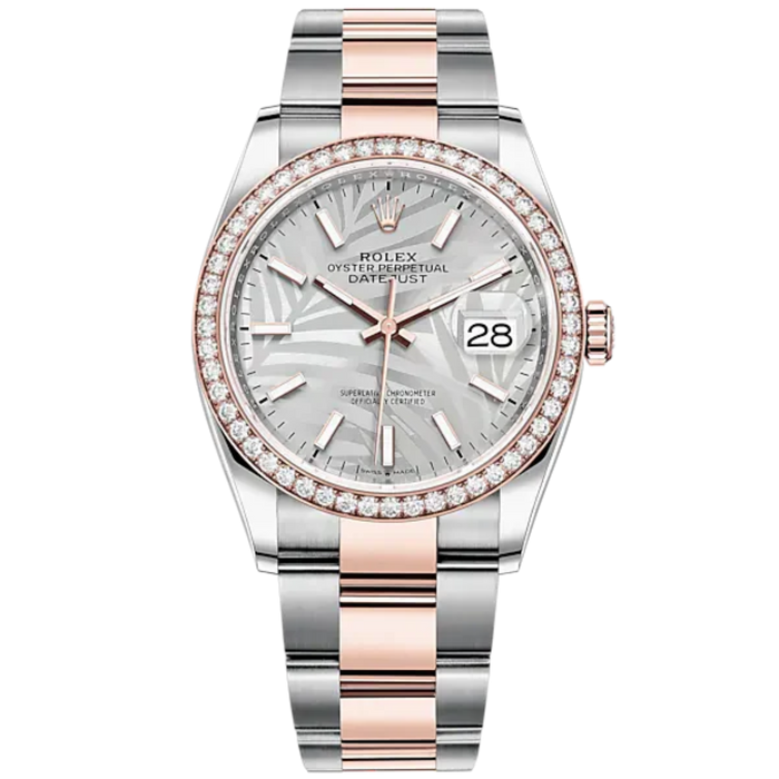 Datejust 36 36mm Oyster Bracelet Oystersteel and Everose Gold with Silver Palm-Motif Dial Diamond-Set Bezel