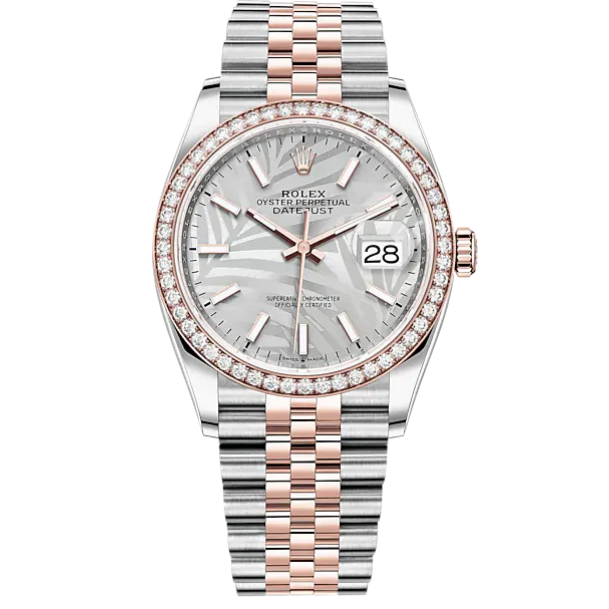 Datejust 36 36mm Oystersteel Jubilee Bracelet and Everose Gold with Silver Palm-Motif Dial Diamond-Set Bezel