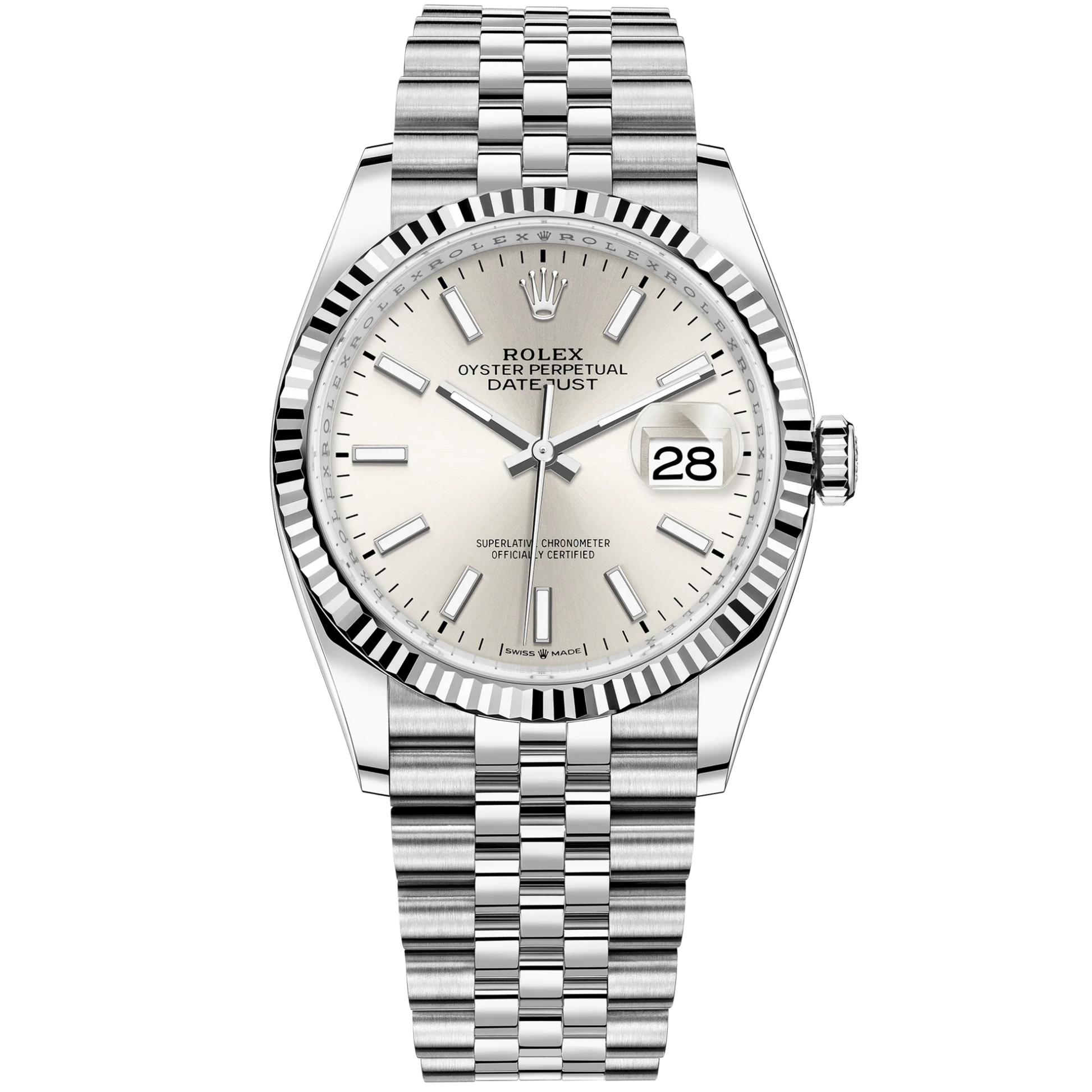 Rolex Datejust Ref. 126234 36mm Jubilee Bracelet and White Gold with Silver Stick Dial Fluted Bezel