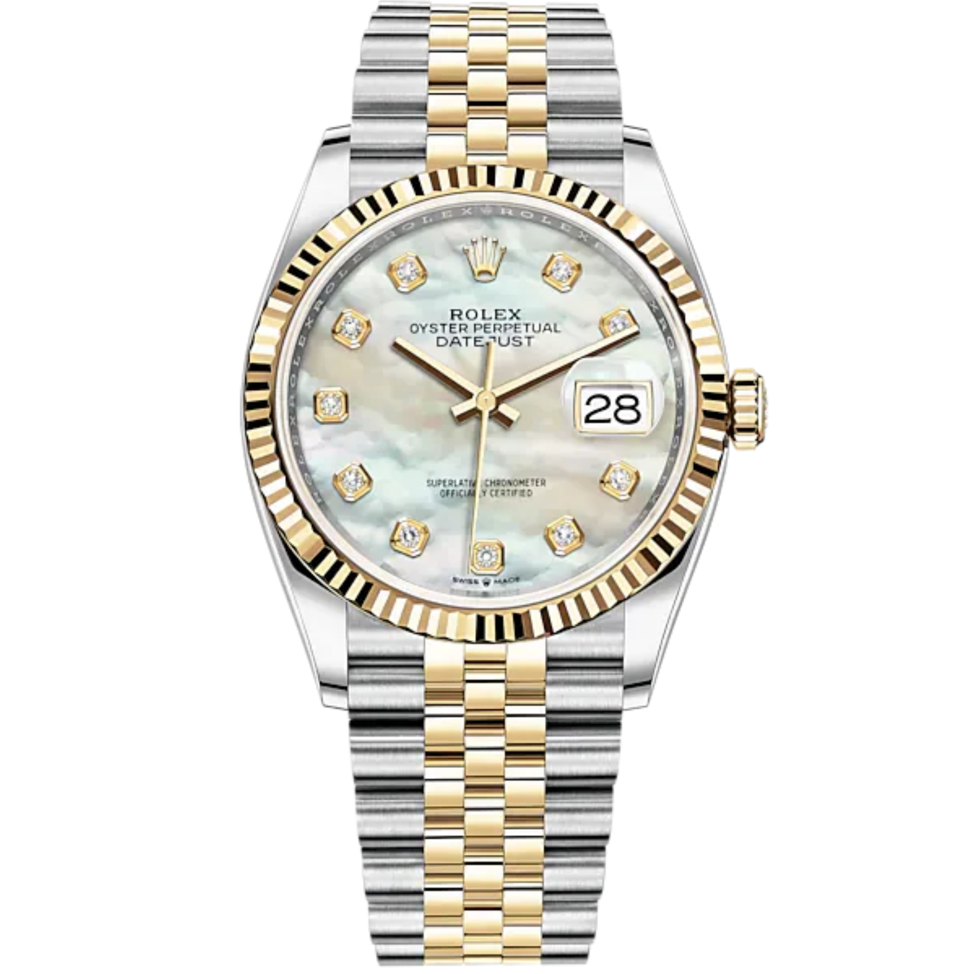 Datejust 36 36mm Oystersteel Jubilee Bracelet and Yellow Gold with White Mother-of-Pearl Diamond-Set Bezel