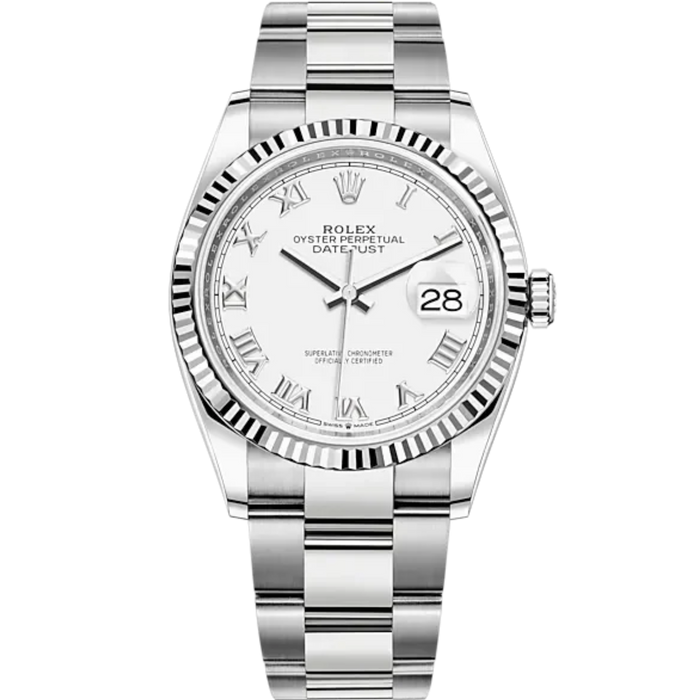 Rolex Datejust Ref. 126234 36mm White Gold Oyster Bracelet White Roman Dial Fluted Bezel
