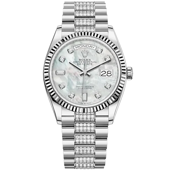 Day-Date 36 36mm President Bracelet and 18 KT White Gold with White Mother-of-Pearl Dial Diamond-Set Dial Fluted Bezel