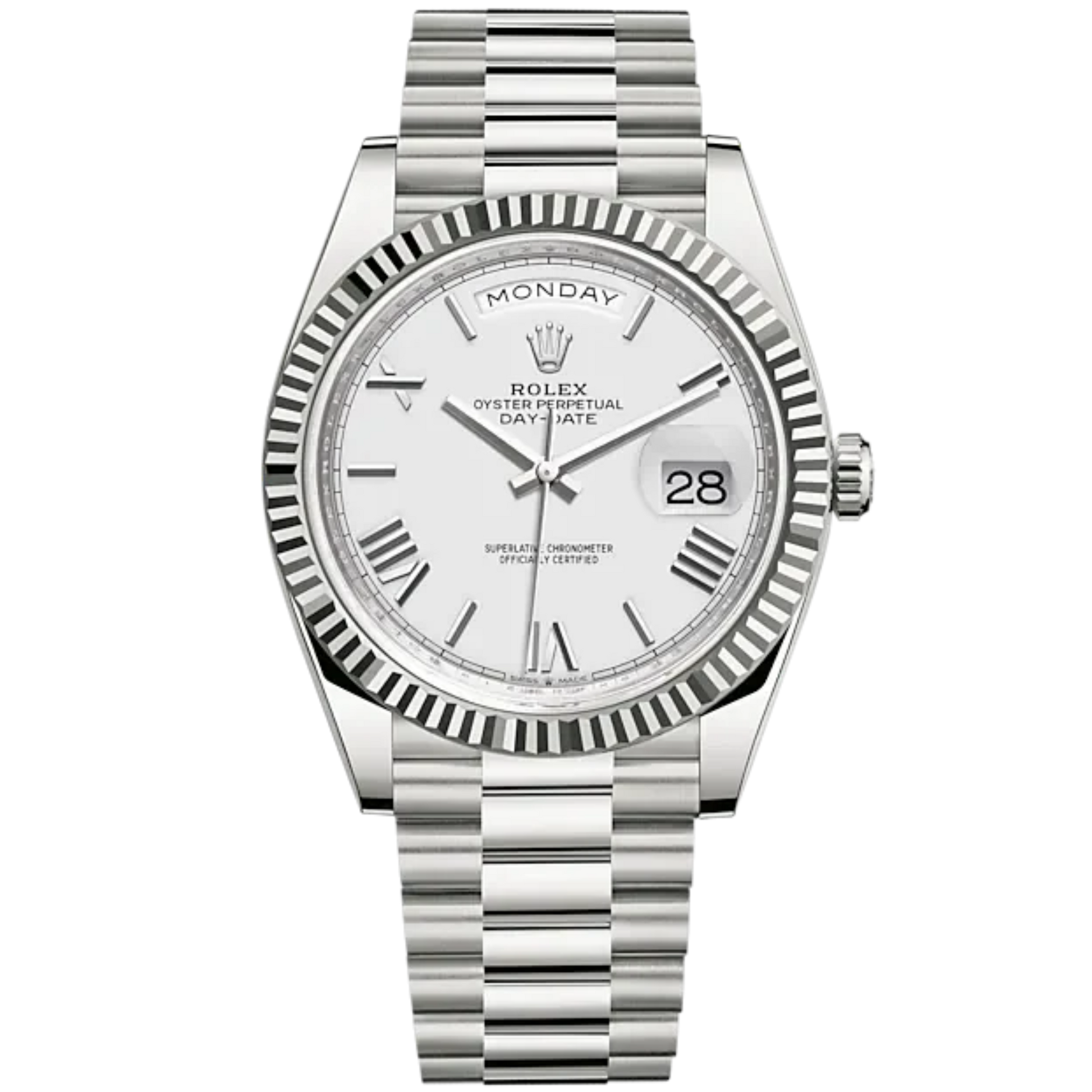 Day-Date 40 40mm President Bracelet and 18 KT White Gold with White Dial and Fluted Bezel
