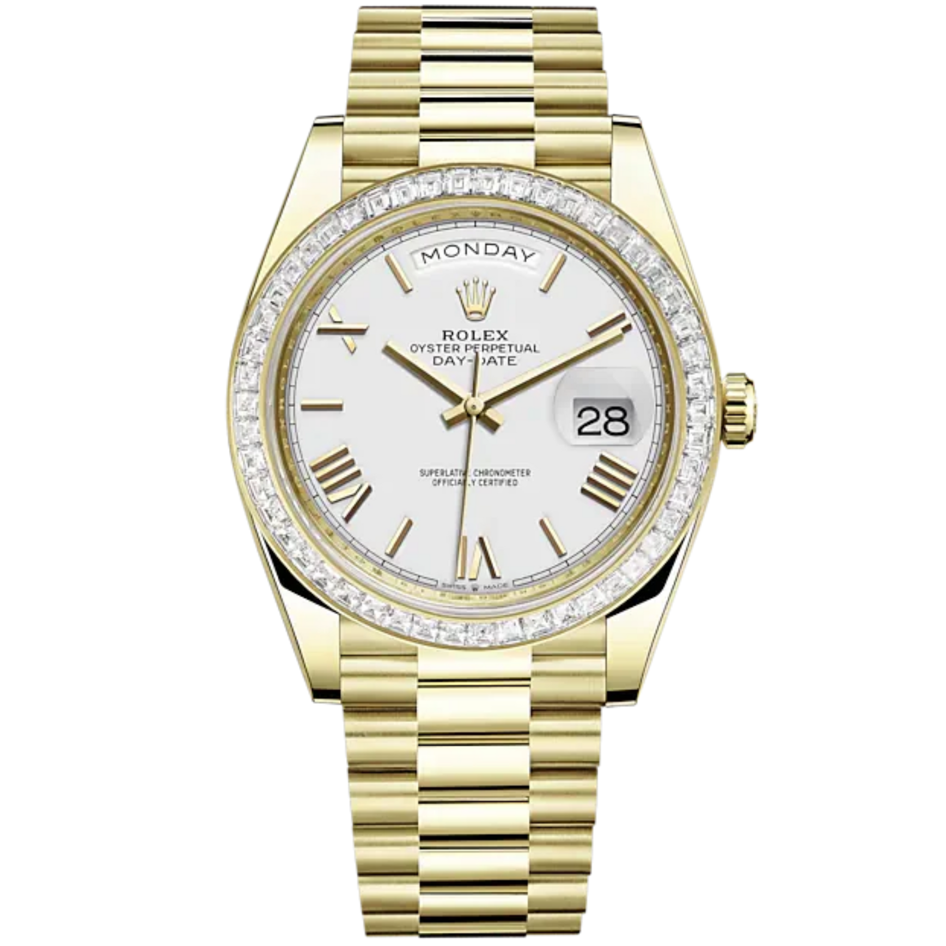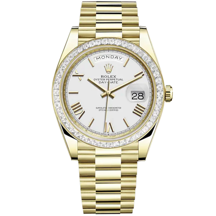 Day-Date 40 40mm President Bracelet and 18 KT Yellow Gold with White Roman Dial and Diamond-Set Bezel