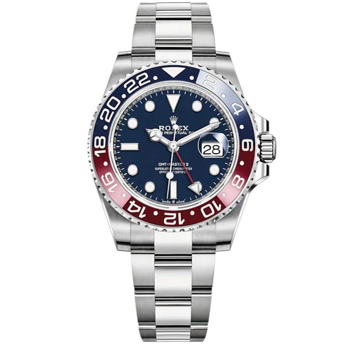 The GMT-Master II has the classic hour, minute, and second hands, plus an arrow-tipped hand that circles the dial every 24 hours. It also features a bidirectional rotatable 24-hour graduated bezel for added convenience.