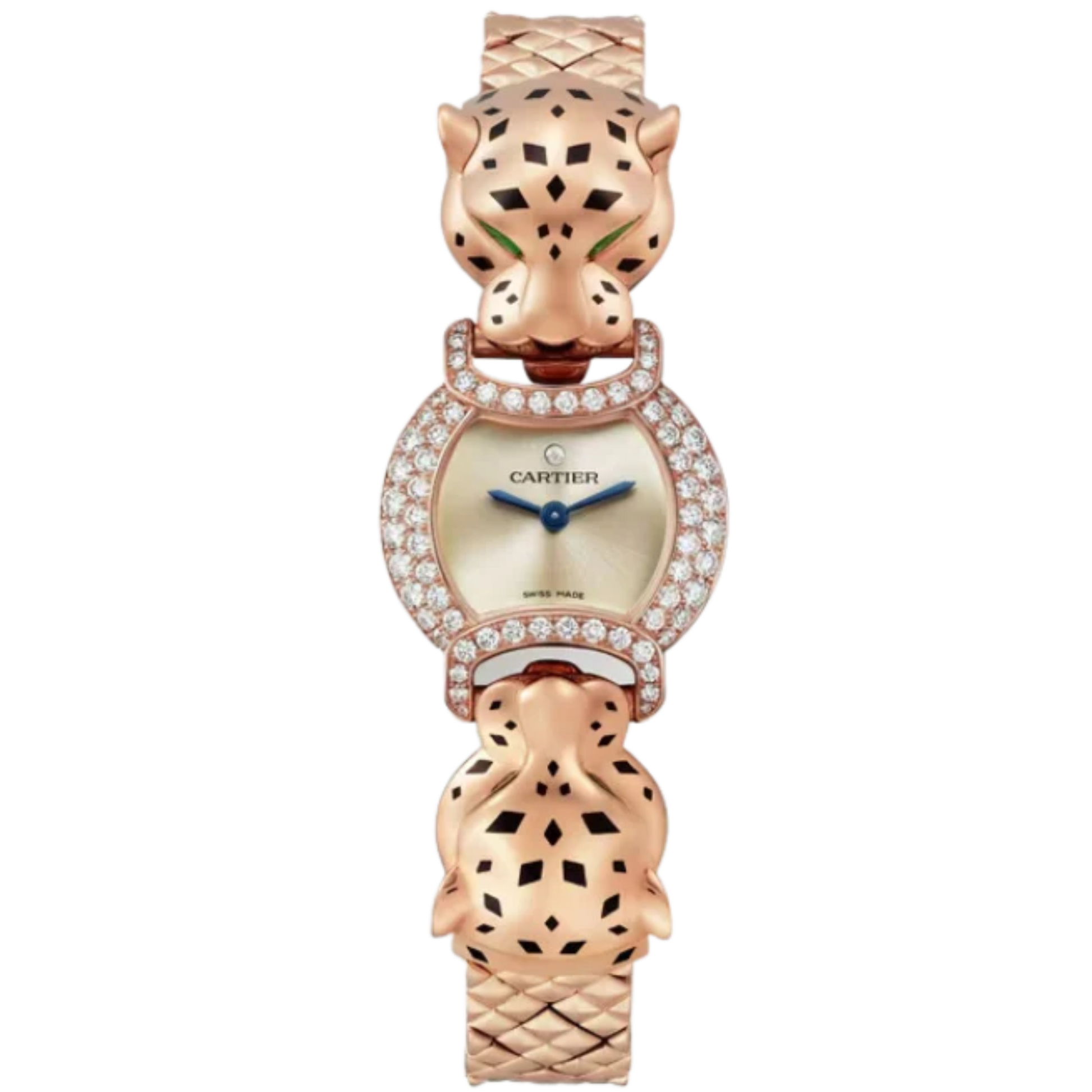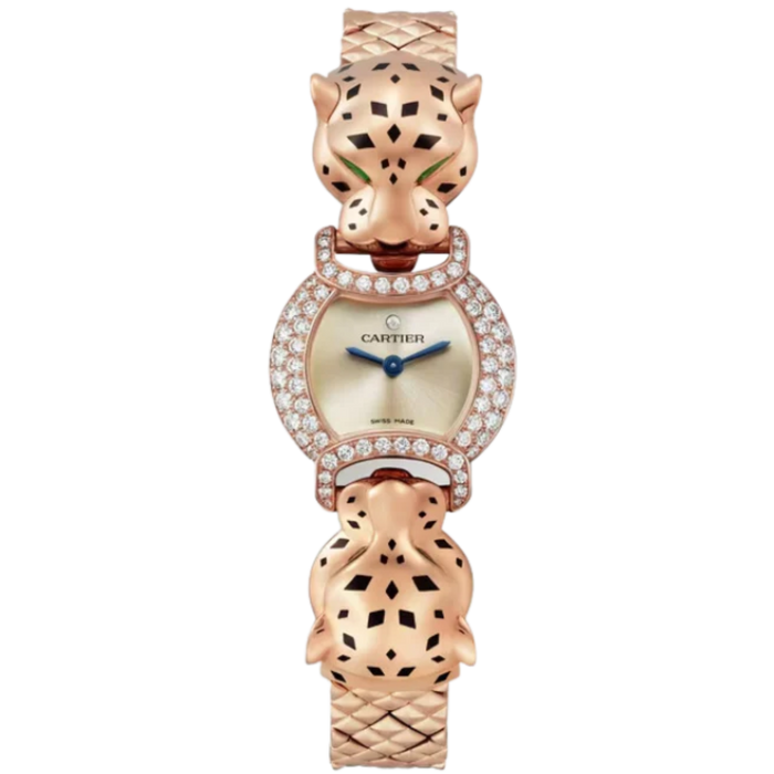A timepiece that seamlessly transforms into a captivating adornment, the Panthere de Cartier stands out as one of Cartier's most unique designs. Embellished with opulent gold, dazzling diamonds, and exquisite gemstones, it epitomizes a timeless accessory for a woman destined to capture attention. Its magnetic allure, untamed spirit, feline grace, and unbridled freedom make it a truly remarkable piece.