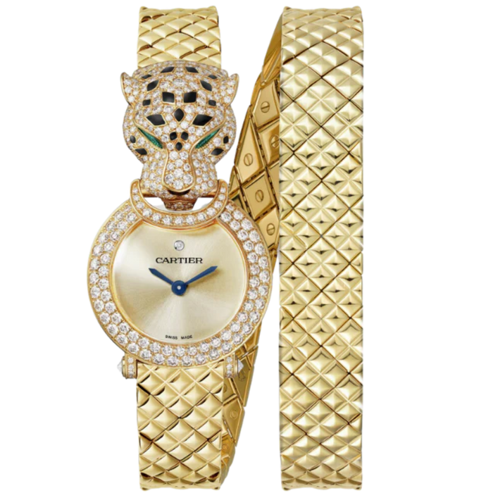 A timepiece that seamlessly transforms into a captivating adornment, the Panthere de Cartier stands out as one of Cartier's most unique designs. Embellished with opulent gold, dazzling diamonds, and exquisite gemstones, it epitomizes a timeless accessory for a woman destined to capture attention. Its magnetic allure, untamed spirit, feline grace, and unbridled freedom make it a truly remarkable piece.