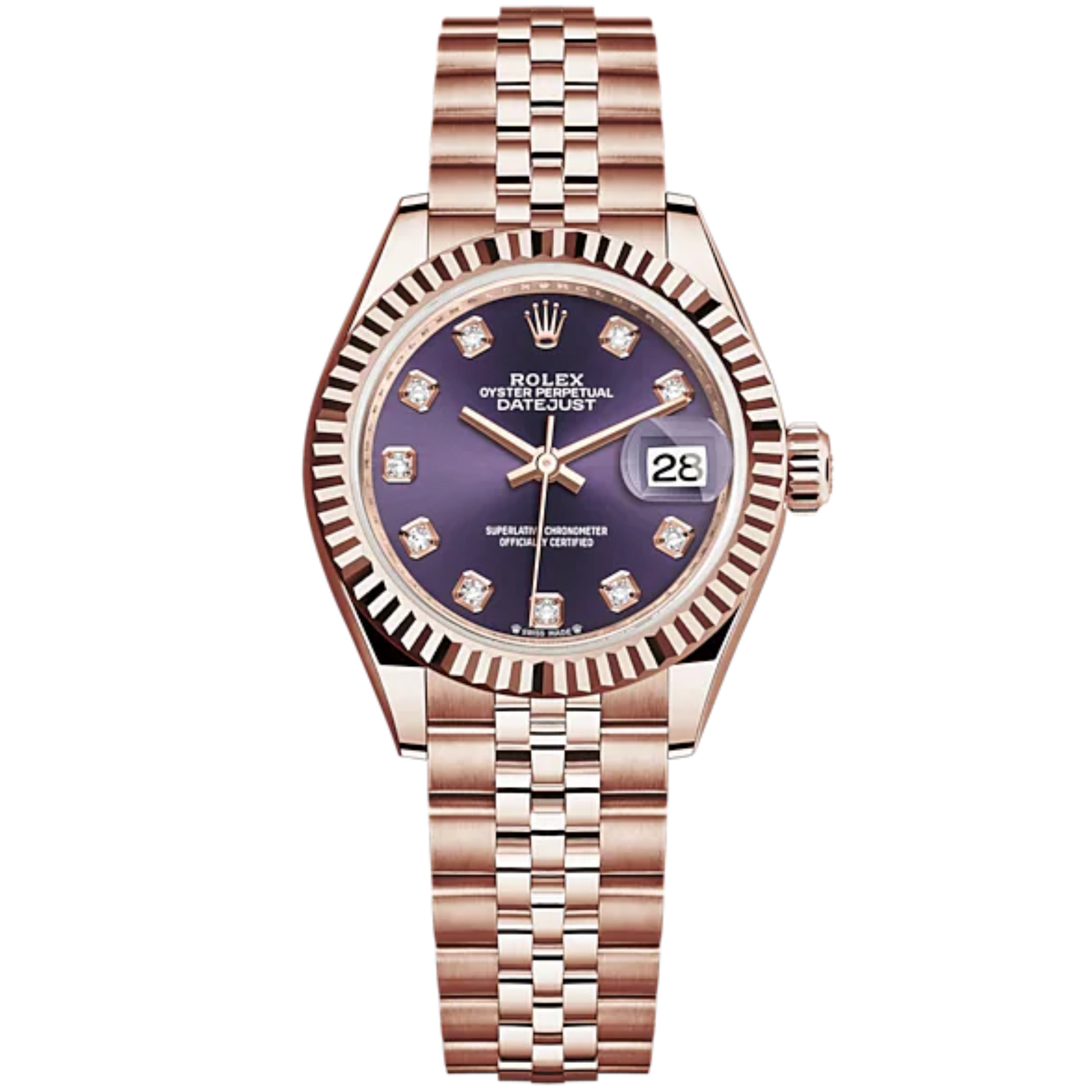 Lady-DateJust 28mm Jubilee Bracelet and 18 KT Everose Gold with Aubergine Dial Diamond-Set Dial Fluted Bezel