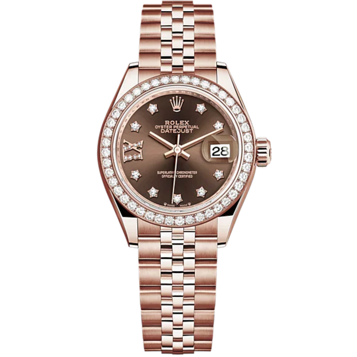 Lady-DateJust 28mm Jubilee Bracelet and 18 KT Everose Gold with Chocolate Dial Diamond-Set Dial Diamond-Set Bezel