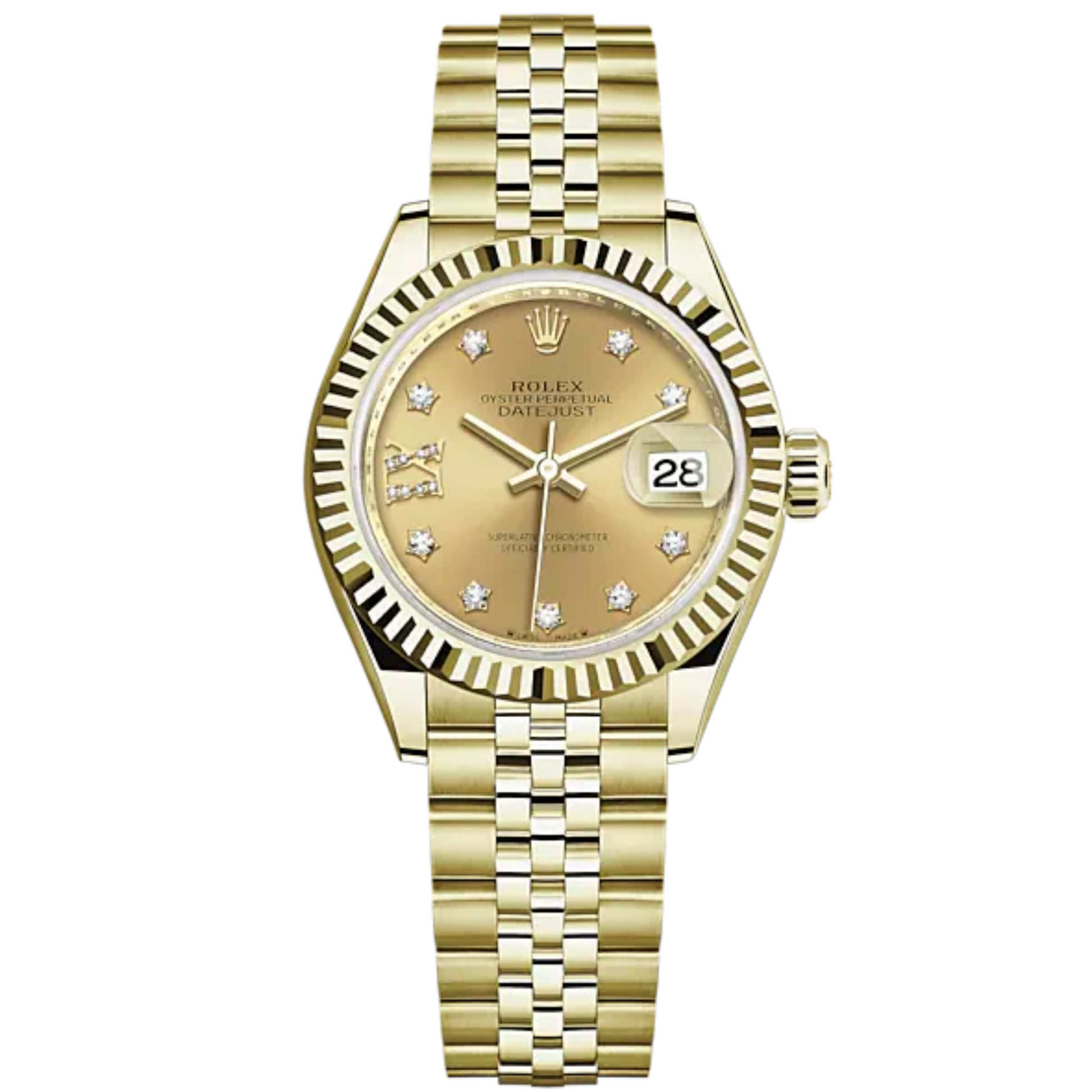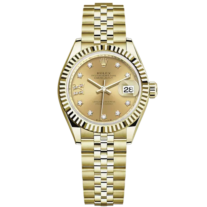 Lady-DateJust 28mm Jubilee Bracelet and 18 KT Yellow Gold with Champagne-Colour Dial Diamond-Set Dial Fluted Bezel