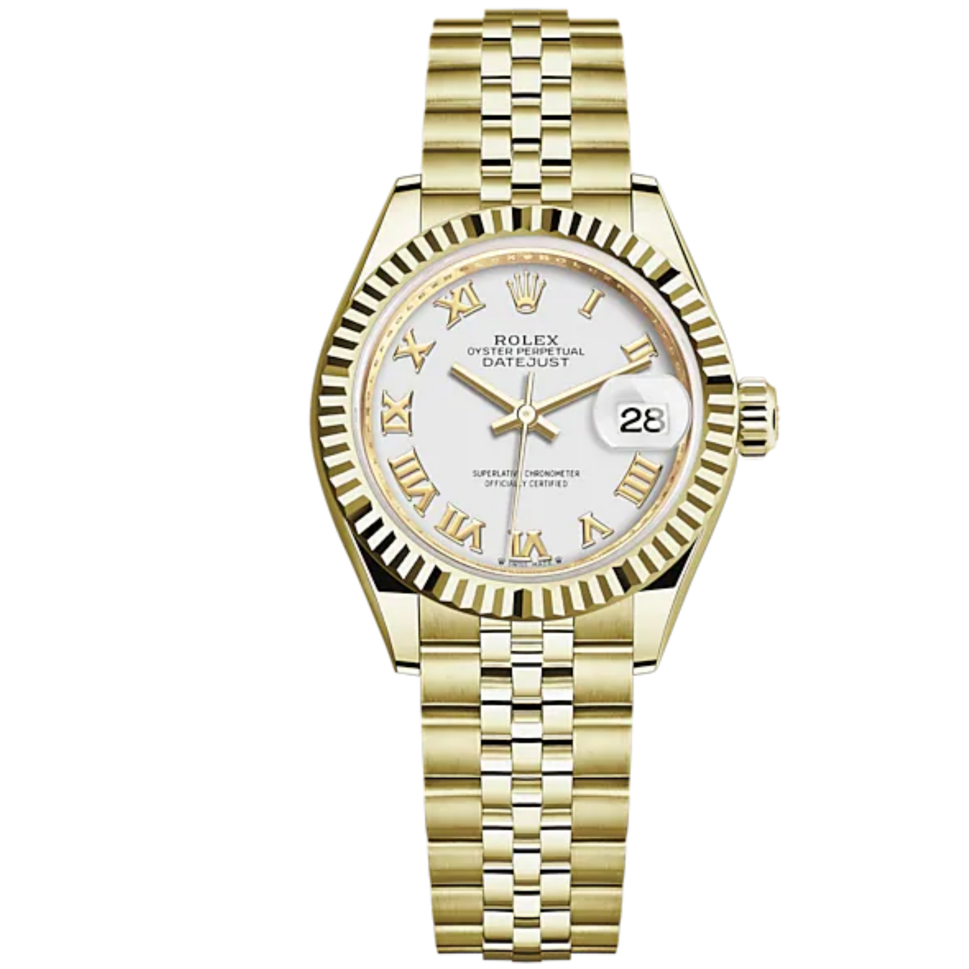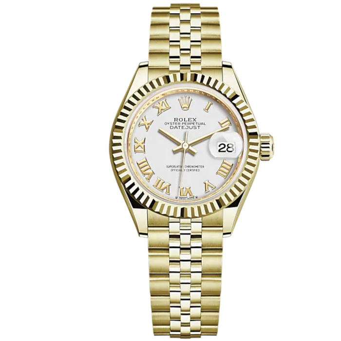 Lady-DateJust 28mm Jubilee Bracelet and 18 KT Yellow Gold with White Dial and Fluted Bezel