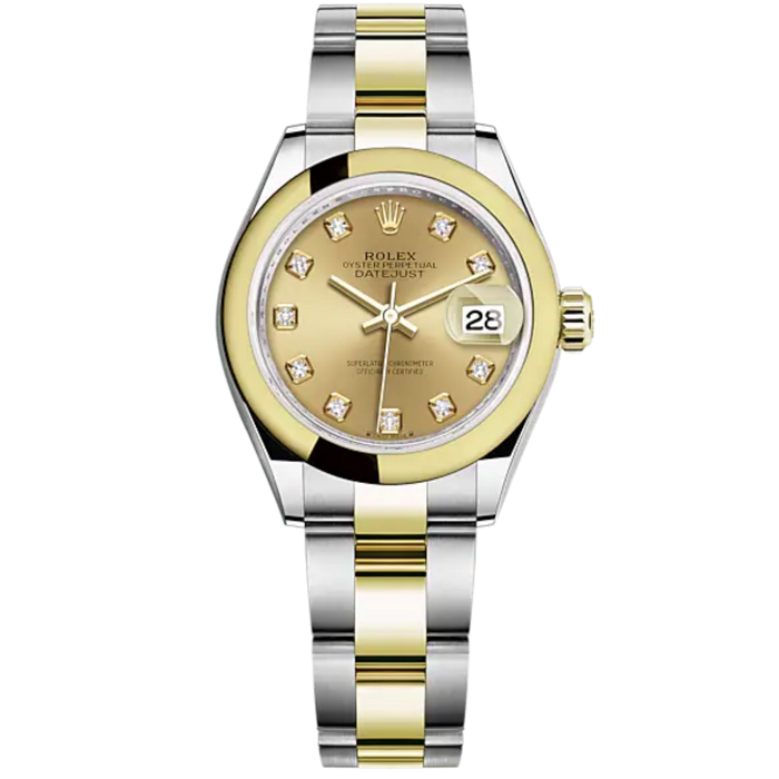 Lady-DateJust 28mm Oyster Oystersteel Bracelet and Yellow Gold with Champagne-Colour Dial Diamond-Set Dial and Domed Bezel