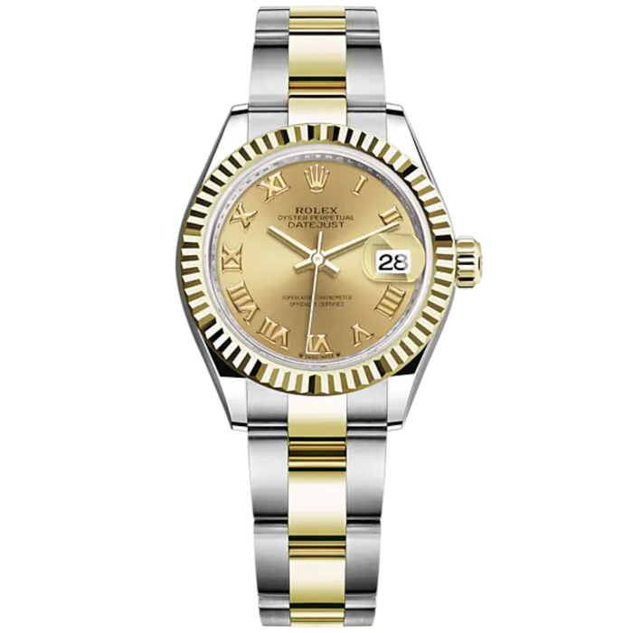Lady-DateJust 28mm Oyster Oystersteel Bracelet and Yellow Gold with Champagne-Colour Dial Fluted Bezel