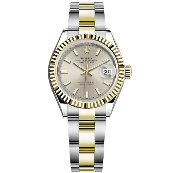 Lady-DateJust 28mm Oyster Oystersteel Bracelet and Yellow Gold with Silver Dial and Fluted Bezel