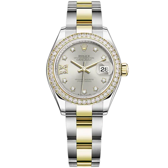 Lady-DateJust 28mm Oyster Oystersteel Bracelet and Yellow Gold with Silver Dial Diamond-Set Dial and Diamond-Set Bezel