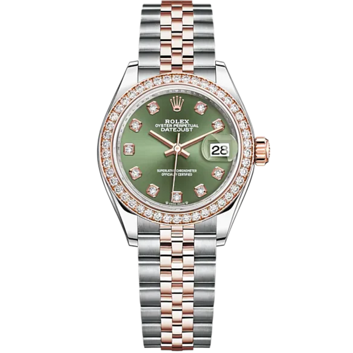 Lady-DateJust 28mm Oystersteel Jubilee Bracelet and Everose Gold with Olive-Green Dial Diamond-Set Dial Diamond-Set Bezel