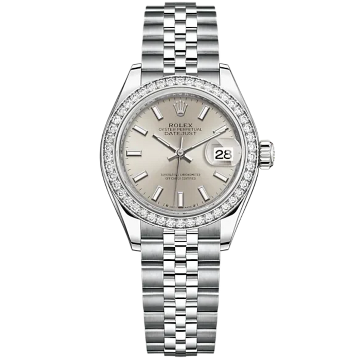 Lady-DateJust 28mm Oystersteel Jubilee Bracelet and White Gold with Silver Dial Diamond-Set Bezel