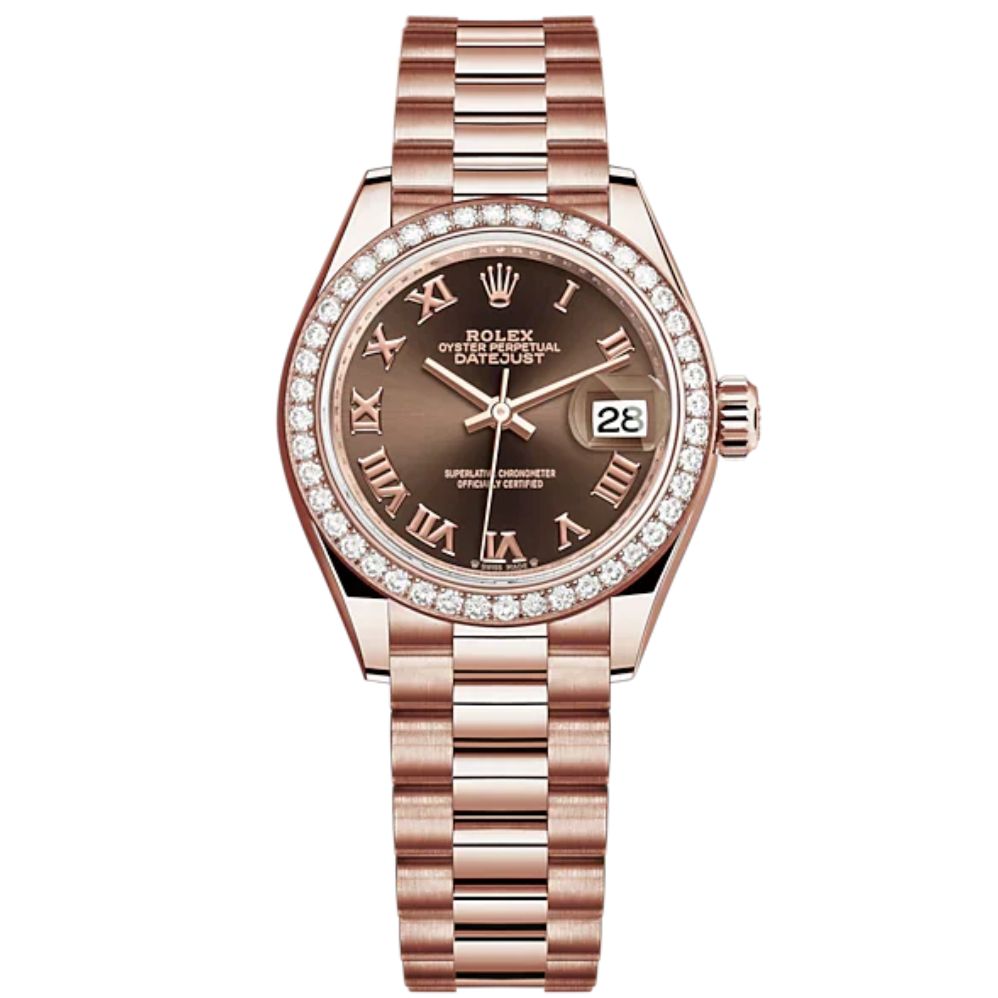 Lady-DateJust 28mm President Bracelet and 18 KT Everose Gold with Chocolate Dial and Diamond-Set Bezel