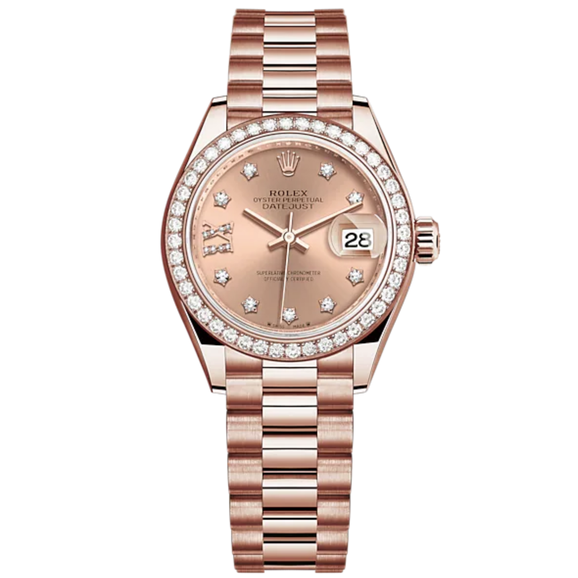 Lady-DateJust 28mm President Bracelet and 18 KT Everose Gold with Rosé-Colour Dial Diamond-Set Dial and Diamond-Set Bezel
