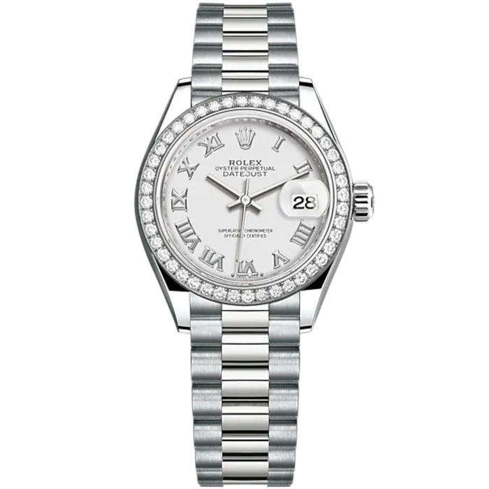 Lady-DateJust 28mm President Bracelet and 18 KT White Gold with White Dial and Diamond-Set Bezel