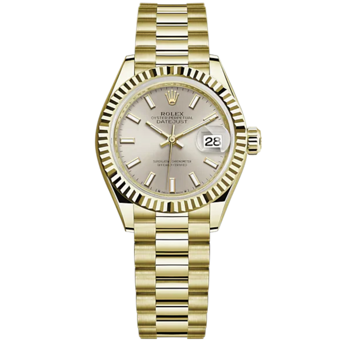 Lady-DateJust 28mm President Bracelet and 18 KT Yellow Gold with Silver Dial Fluted Bezel
