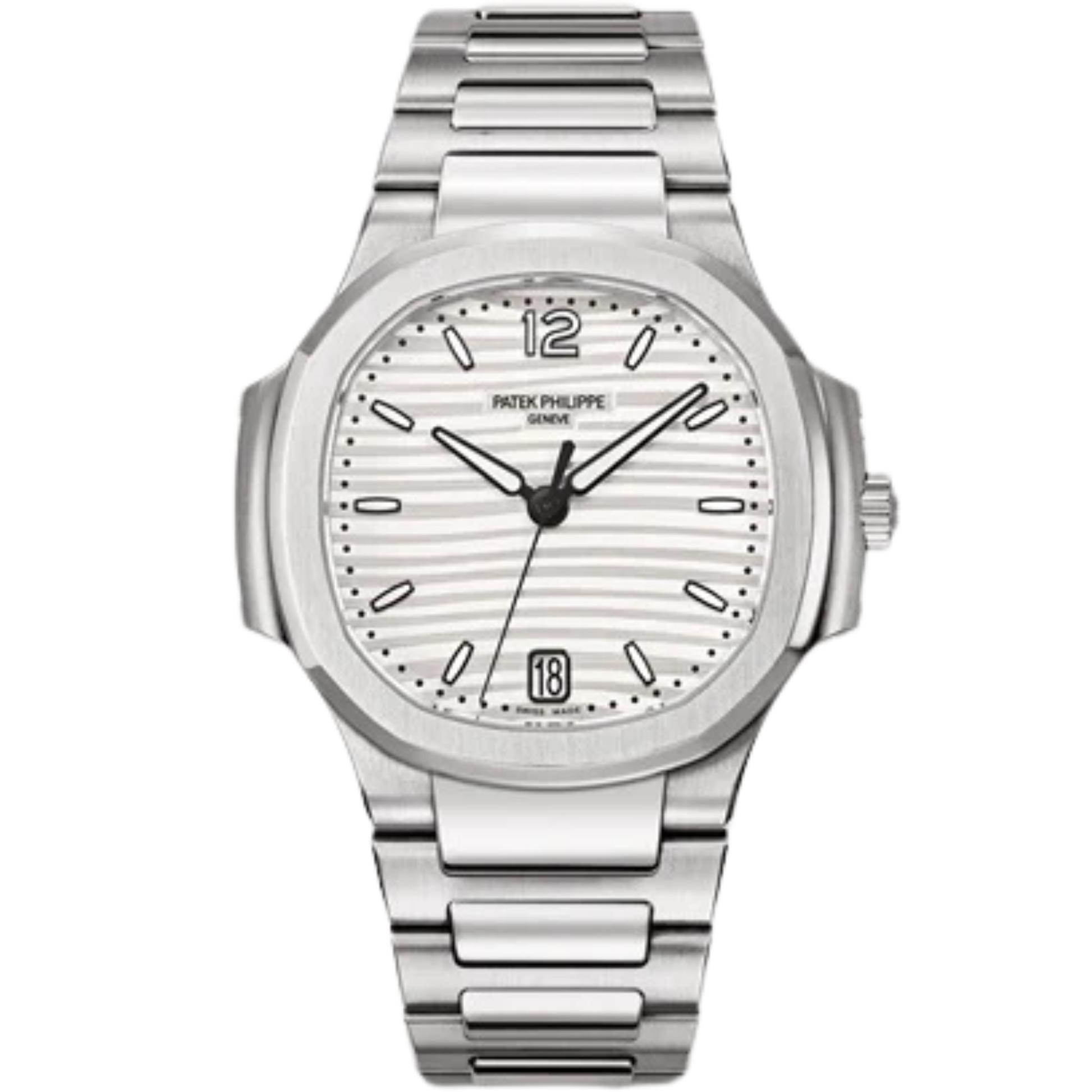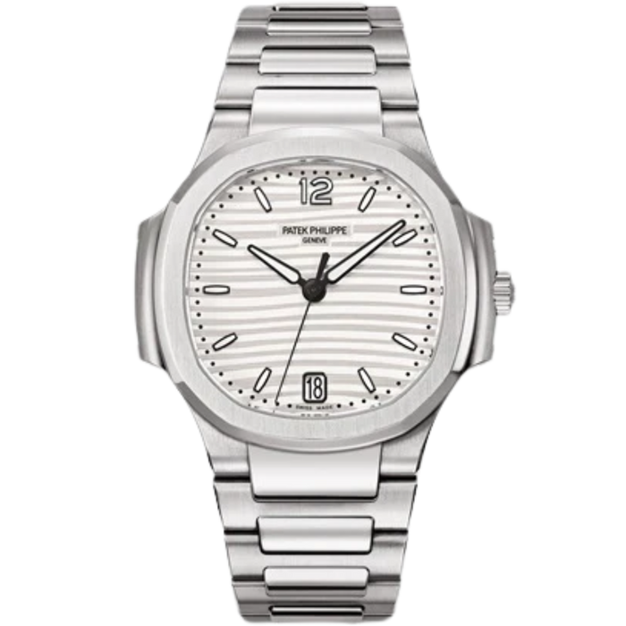 The Ladies Automatic Nautilus wristwatch made of stainless steel, now comes in two new dial colors- silvery opaline and smoke gray, which emphasizes its casual elegance and feminine style. The watch has an undulating embossed decor, which gives it a distinctly ladylike interpretation of the Nautilus. The applied numerals and hands are luminous to ensure improved readability.