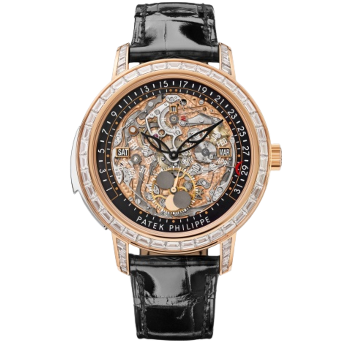 This gorgeous reference 5304 Grand Complication self-winding watch with a minute repeater and retrograde perpetual calendar has been re-made in a new rose gold edition. To make it even more dazzling, the bezel, lugs, and fold-over clasp are all adorned with 80 sparkling baguette-cut diamonds that amount to 6.22 cts. The calendar display system is highlighted by the addition of sapphire disks and the sides of the case boast delightful "leaf" motif engravings with white gold inserts. The rose gold mini-rotor can be seen through the transparent case back, completing this stunning design.