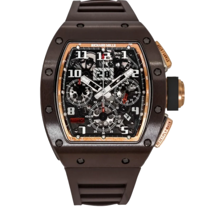 The TZP-N ceramic used in the RM011 Asia Boutique creates a stunning appearance. The 50mm case is made with an 18ct rose gold caseband, a brown ceramic case, and an 18k rose gold bezel. It has a skeletonized dial, and the rubber bracelet with double folding clasp embodies the brand's signature aesthetics.