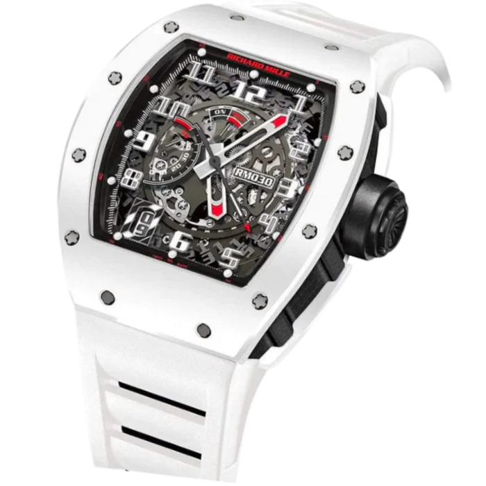Richard Mille's most famous attributes are embodied in a new white ceramic and black NTPT carbon limited edition of the RM 030 Automatic with Declutchable Rotor: a tonneau-shaped tripartite case; boundary-pushing new materials; and a hand-finished innovative movement that achieves a new level of performance for haute horlogerie. The front and back bezels of the RM 030 White Rush limited edition are made of white ATZ sandblasted ceramic. The white bezels and rubber strap stand out against the NTPT carbon caseband and crown, as well as the sapphire dial with scarlet hands and a winding indicator.
