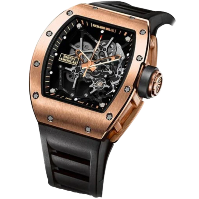 RM 035 Gold Toro by Richard Mille. The tripartite, tonneau-shaped case of the RM 035 Gold Toro is made of satin-finished 18-karat rose gold. The crown, buckle, and hands of the timepiece are also made of gold. The skeletonized movement of the watch is visible from the front and back thanks to the sapphire caseback, which is presented on a black rubber strap with a matching crown protector. The RM 035 Gold Toro is a numbered, 50-piece limited edition that is only available at Richard Mille retailers in the Americas.
