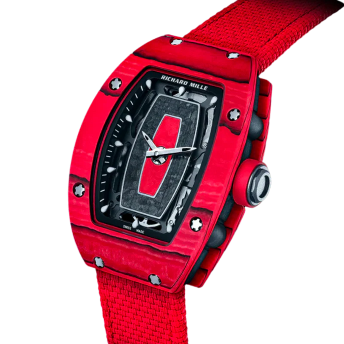 The new Racing Red Richard Mille RM 07-01 model is named after the fiery red car driven by the Richard Mille Racing Team. The Richard Mille RM 07-01 Racing Red case measures 45.66 x 31.40 mm and is made of Red Quartz TPT, a high-tech material composed of parallel filaments formed by the separation of silicon dioxide threads. These are then woven together after being soaked in a red synthetic resin. The material is heated to 120° in an autoclave (a pressurized oven) at a pressure of 6 bar and then processed.