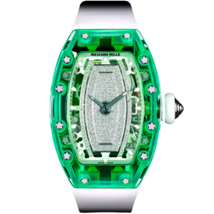 RM 07-02 Green Sapphire White Rubber Strap Green Mother-Of-Pearl Jasper or Pave Stones Dial Green Sapphire Case