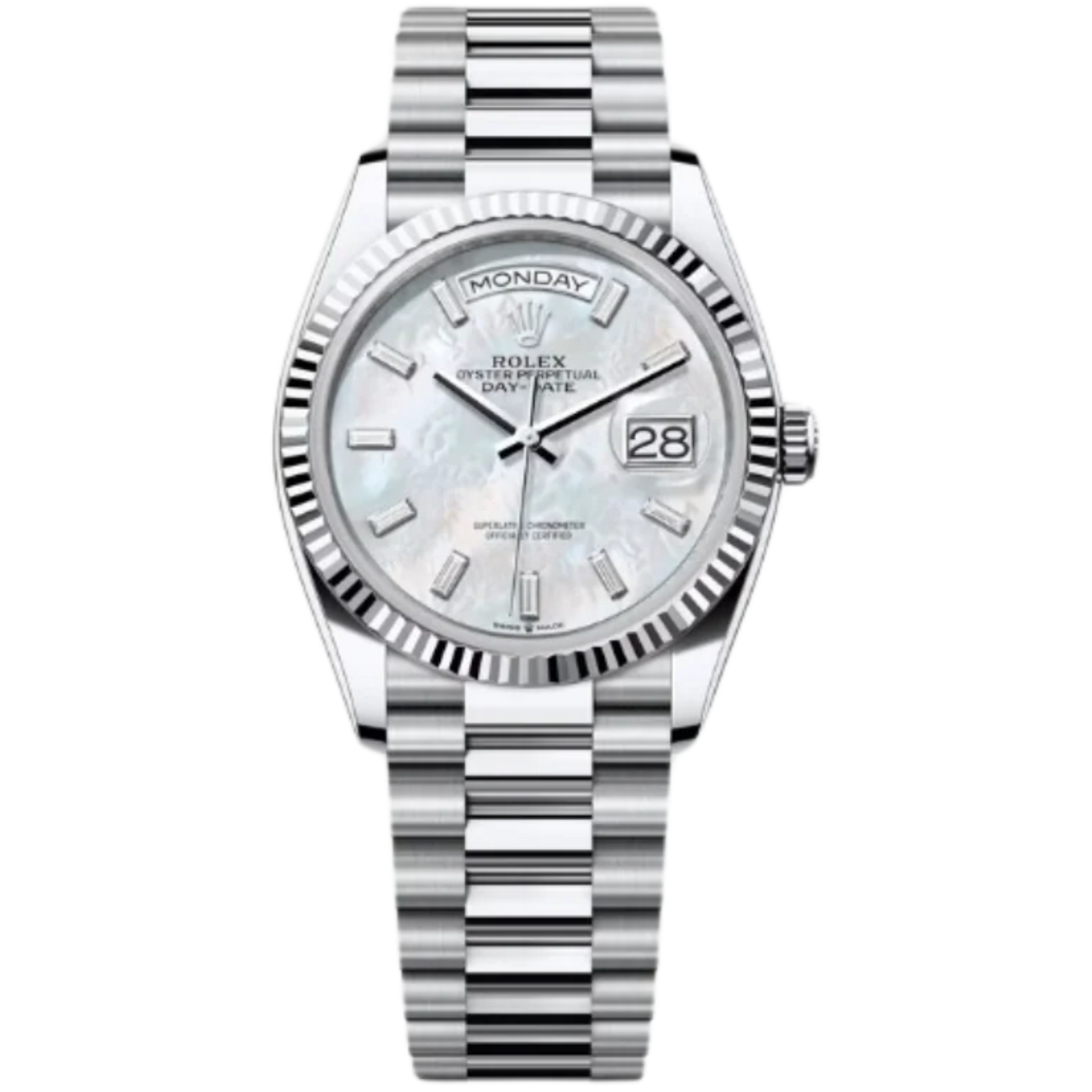 Rolex Day-Date Ref. 128236 36MM Platinum Case Mother of Pearl Dial with Baguette Diamonds