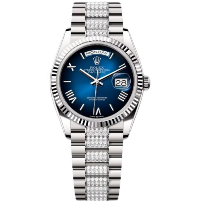 Rolex Day-Date Ref. 128239 36MM White Gold Case Ombré Blue Dial Diamond Set Links