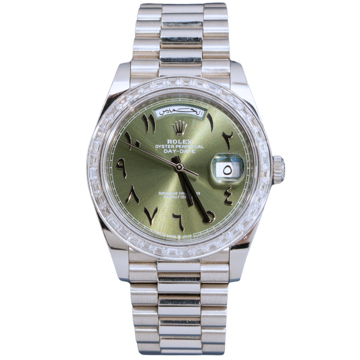 Rolex Day-Date Ref. 228396TBR Platinum Green Arabic Dial Baguette Bezel