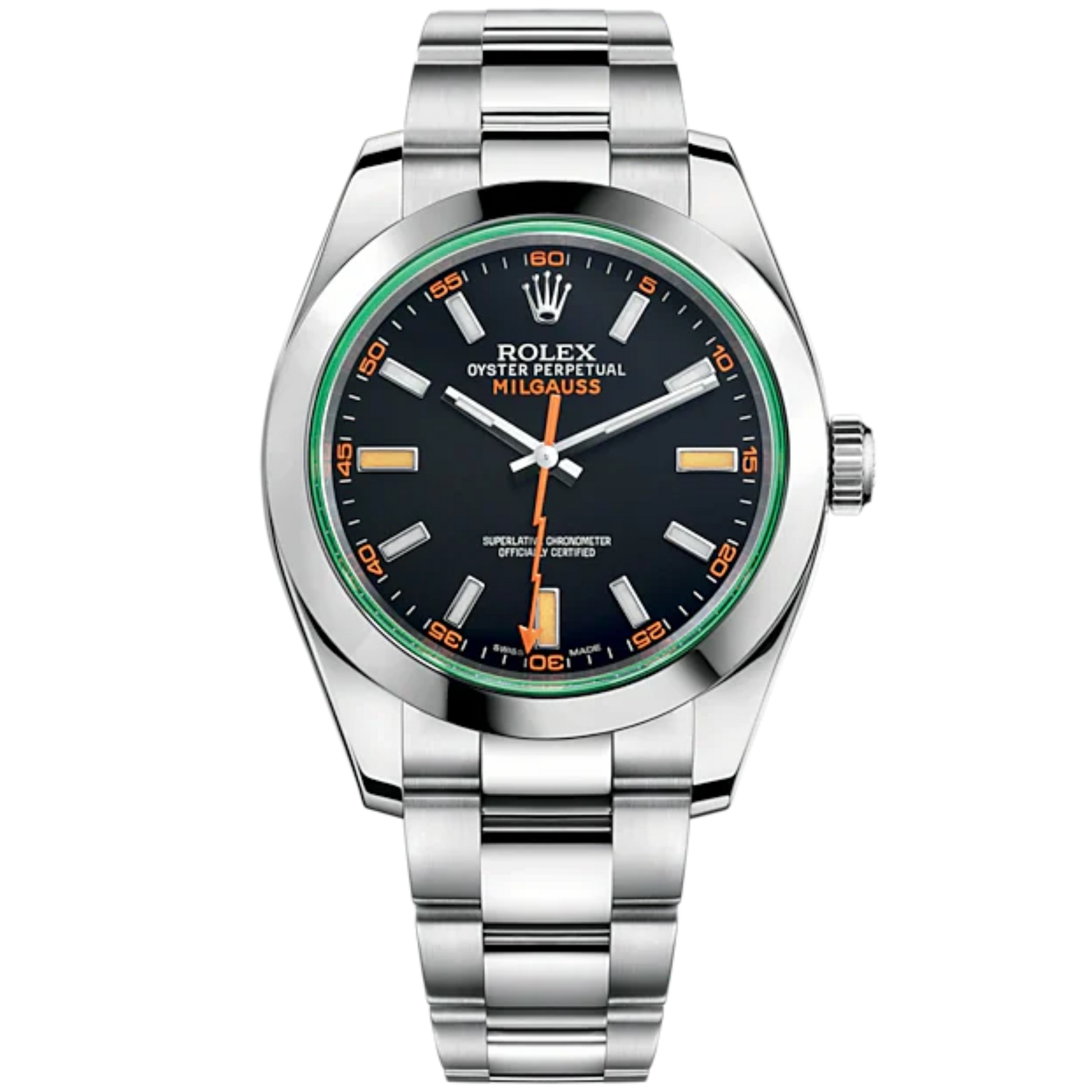 Rolex has designed a special green sapphire crystal that is exclusively featured on the Milgauss. This watch crystal provides unbeatable scratch and fade resistance.