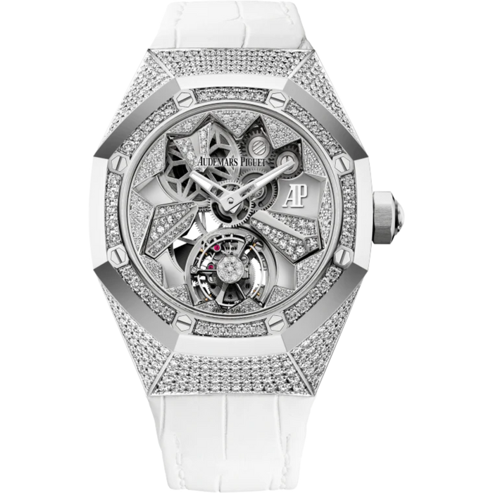Royal Oak Concept 38.5mm Flying Tourbillon White Aligator Strap with 18-Carat White Gold Case Entirely Set Diamonds Flying Tourbillon