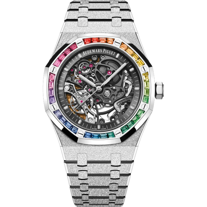 A 41 mm timepiece, ranging from white Frosted gold to slate grey, is adorned with a bezel of multicoloured gemstones in a rainbow of shades. The movement is openworked, providing a unique look and feel.