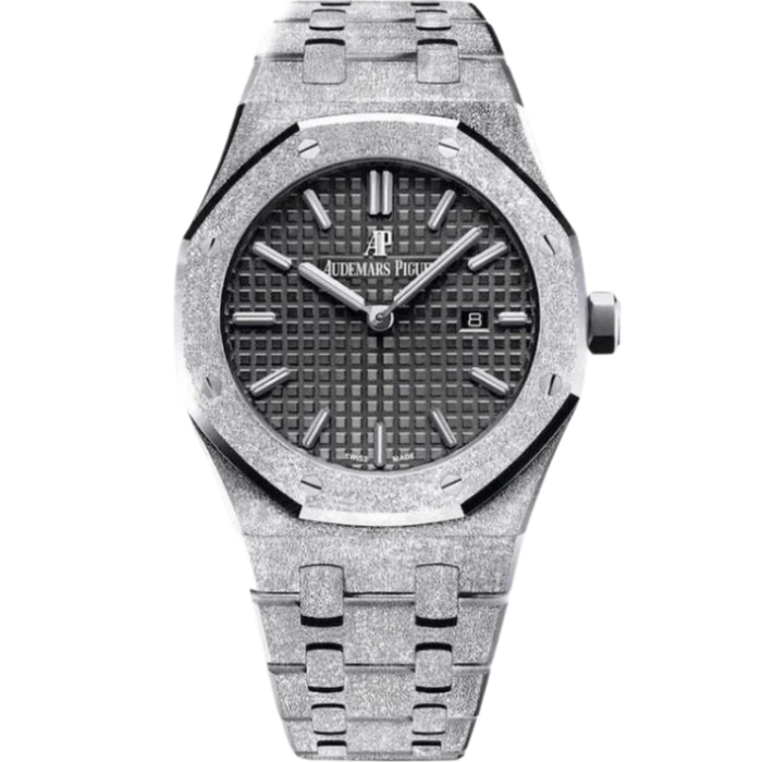 Royal Oak Frosted Gold Quartz Hammered 18-Carat White Gold Bracelet Black Dial With Grande Tapisserie Pattern Hammered 18-Carat White Gold Case FROSTED GOLD QUARTZ