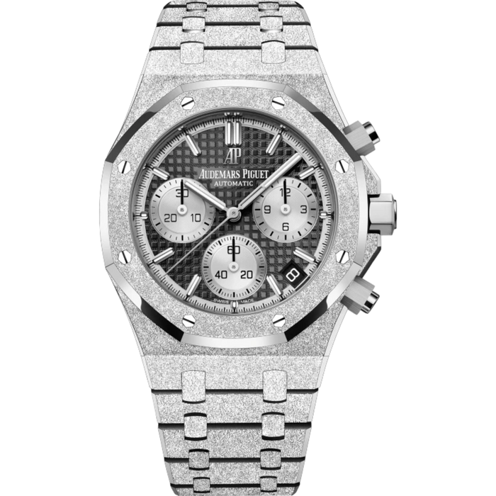 Royal Oak Frosted Gold Selfwinding Chronograph 41MM Hammered 18-Carat White Gold Bracelet Black Dial With Grande Tapisserie Pattern Hammered 18-Carat White Gold Case FROSTED GOLD SELFWINDING CHRONOGRAPH
